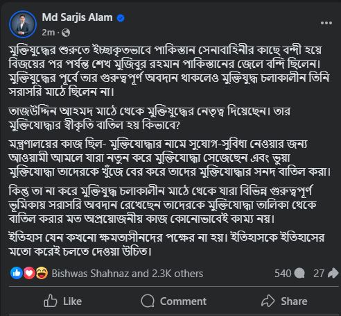 সারজিস আলম আরও উল্লেখ করেন, মন্ত্রণালয়ের কাজ হওয়া উচিত ছিল ভুয়া মুক্তিযোদ্ধাদের শনাক্ত করে তাদের সনদ বাতিল করা, কিন্তু তার পরিবর্তে যারা মুক্তিযুদ্ধের সময় সরাসরি গুরুত্বপূর্ণ ভূমিকা পালন করেছেন তাদের মুক্তিযোদ্ধার তালিকা থেকে বাদ দেওয়া হচ্ছে, যা অগ্রহণযোগ্য ও অনাকাঙ্ক্ষিত।
