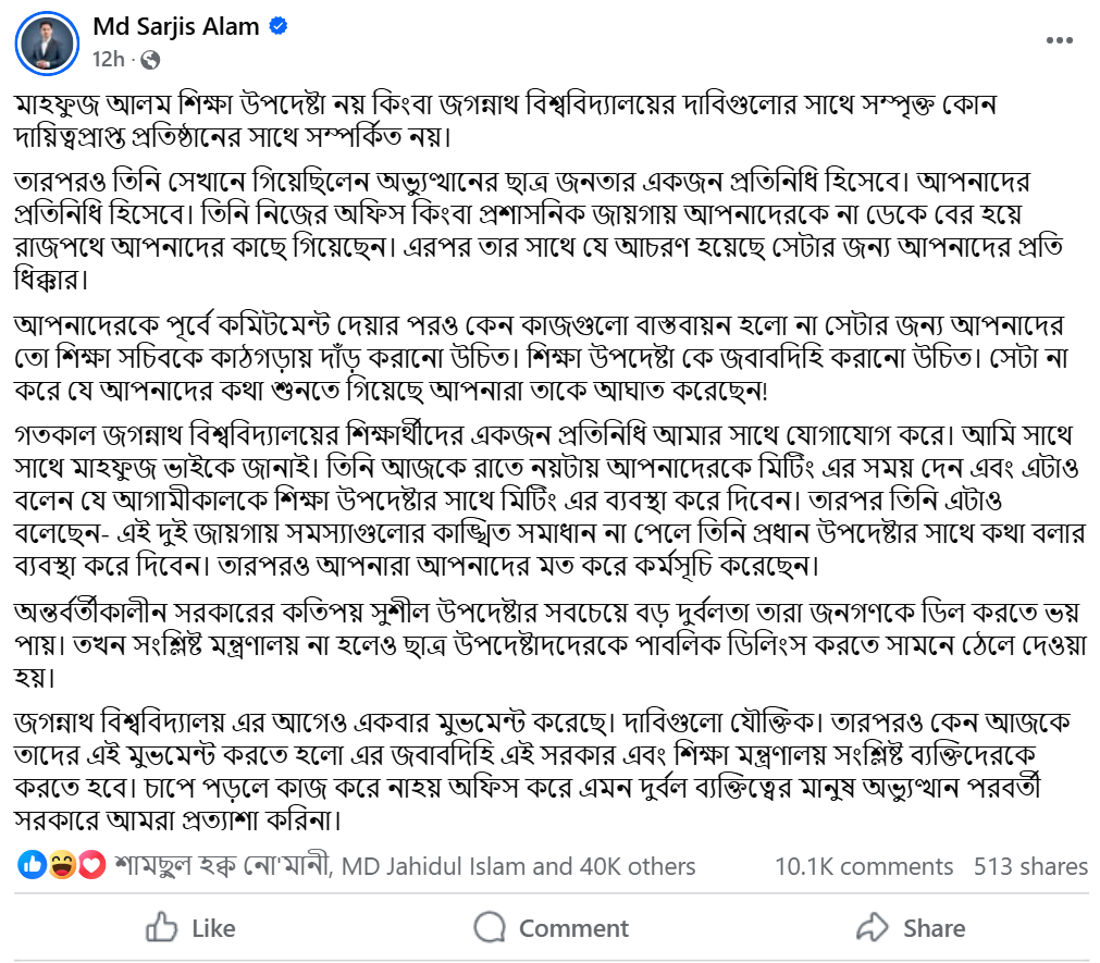 এদিকে মাহফুজ আলমের ওপর হামলার প্রতিবাদে এনসিপির উত্তরাঞ্চলের মুখ্য সংগঠক সারজিস আলমও নিজের অবস্থান জানান ফেসবুক পোস্টে। তিনি লেখেন, “মাহফুজ আলম জবির দাবির সঙ্গে সরাসরি সংশ্লিষ্ট নন। তারপরও তিনি ছাত্র-জনতার একজন প্রতিনিধি হিসেবে কথা শুনতে এসেছিলেন। যারা তাকে লক্ষ্য করে আঘাত করেছে, তারা আন্দোলনের নৈতিক জায়গাটিকে আঘাত করেছে।”
