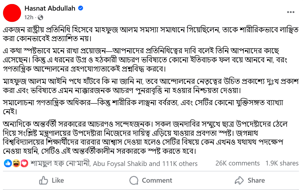 হাসনাত আরও বলেন, “সমালোচনা গণতান্ত্রিক অধিকার, কিন্তু শারীরিক লাঞ্ছনা বর্বরতা—এর কোনো যুক্তিসঙ্গত ব্যাখ্যা নেই। আন্দোলনের নেতৃত্বের উচিত প্রকাশ্যে দুঃখ প্রকাশ করা এবং ভবিষ্যতে এমন আচরণ যাতে না ঘটে তার নিশ্চয়তা দেওয়া।”