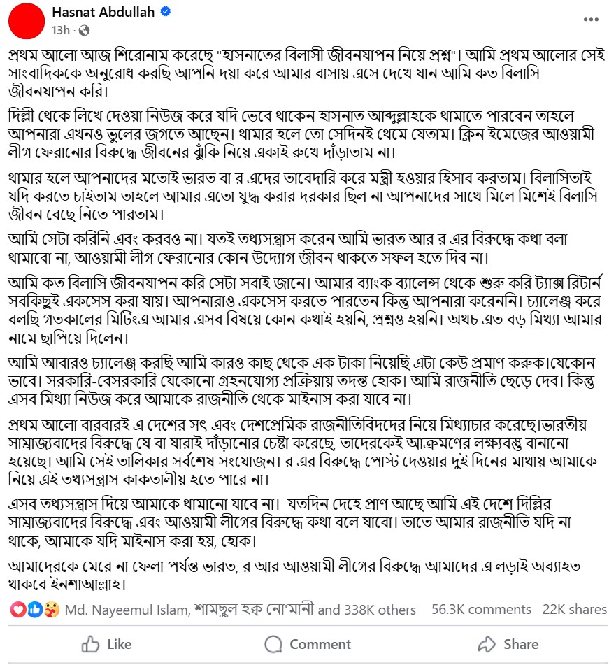 প্রথম আলো আজ (১৯ এপ্রিল) শিরোনাম করেছে ‘হাসনাতের বিলাসী জীবনযাপন নিয়ে প্রশ্ন’। আমি প্রথম আলোর সেই সাংবাদিককে অনুরোধ করছি আপনি দয়া করে আমার বাসায় এসে দেখে যান, আমি কত বিলাসি জীবনযাপন করি।