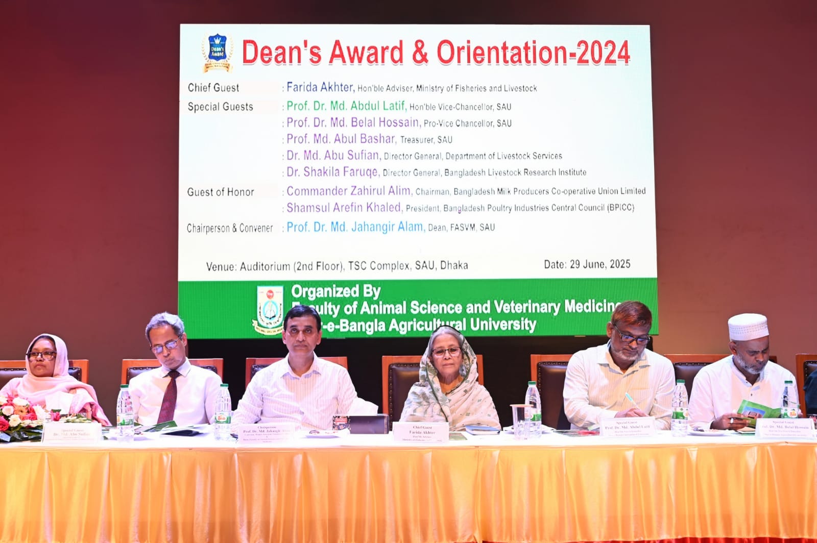 অ্যানিম্যাল সায়েন্স এবং ভেটেরিনারি মেডিসিন অনুষদ আয়োজিত প্রফেসর ড. মোঃ জাহাঙ্গীর আলমের সভাপতিত্বে বিশেষ অতিথি হিসেবে বক্তৃতা করেন শেরেবাংলা কৃষি বিশ্ববিদ্যালয়ের উপাচার্য প্রফেসর ড. মো: আব্দুল লতিফ, ঢাকা কৃষি বিশ্ববিদ্যালয়ের উপ-উপাচার্য প্রফেসর ড. মো: বেলাল হোসেন, প্রাণিসম্পদ অধিদপ্তরের মহাপরিচালক ড.মো: আবু সুফিয়ান, বাংলাদেশ প্রাণিসম্পদ গবেষণা ইনস্টিটিউটের মহাপরিচালক ড.শাকিলা ফারুক, সম্মানিত অতিথি হিসেবে বক্তৃতা করেন বাংলাদেশ মিশ্র খাদ্য উৎপাদক সমবায় ইউনিয়ন লিমিটেডের চেয়ারম্যান কমান্ডার জহিরুল আলীম, বাংলাদেশ পোলট্রি ইন্ডাস্ট্রিজ সেন্ট্রাল কাউন্সিলের সভাপতি শামসুল আরেফিন খালেদ। বিশ্ববিদ্যালয়ের বিভিন্ন অনুষদের ডিন, শিক্ষকমন্ডলী, শিক্ষার্থীরা ও অ্যানিম্যাল সায়েন্স এবং ভেটেরিনারি মেডিসিন অনুষদের ডিন পুরস্কারপ্রাপ্তরা উপস্থিত ছিলেন।