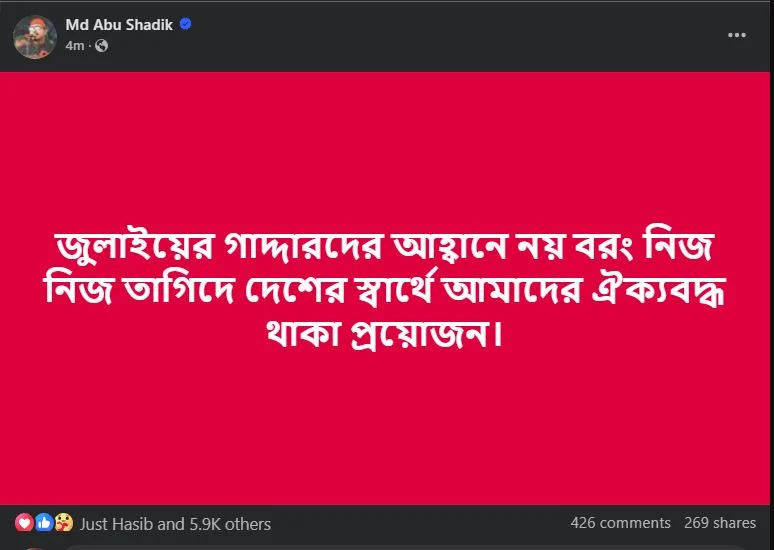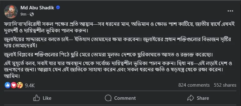 দেশের চলমান রাজনৈতিক পরিস্থিতিতে আবারও ঐক্যের আহ্বান জানিয়েছেন বাংলাদেশ ইসলামী ছাত্রশিবিরের কেন্দ্রীয় প্রকাশনা সম্পাদক ও ঢাকা বিশ্ববিদ্যালয় শাখার সাবেক সভাপতি সাদিক কায়েম। বৃহস্পতিবার (২২ মে) নিজের ভেরিফায়েড ফেসবুক আইডিতে দেয়া এক স্ট্যাটাসে তিনি বলেন, ‘জুলাইয়ের গাদ্দারদের আহ্বানে নয়, বরং নিজ নিজ তাগিদে দেশের স্বার্থে আমাদের ঐক্যবদ্ধ থাকা প্রয়োজন।’