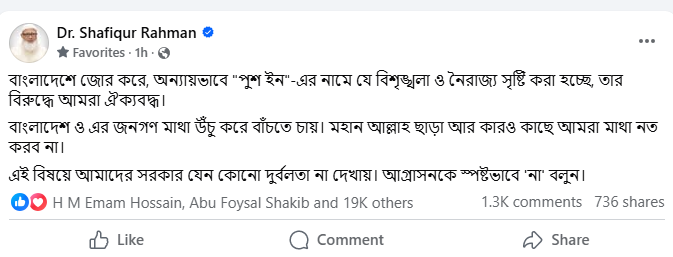 পোস্টে ডা. শফিকুর রহমান বলেন, “গায়ের জোরে, অন্যায়ভাবে বাংলাদেশে ‘পুশ ইন’-এর নামে যে বিশৃঙ্খলা ও নৈরাজ্য সৃষ্টি করা হচ্ছে, তার বিরুদ্ধে আমরা ঐক্যবদ্ধ। বাংলাদেশ ও এর জনগণ মাথা উঁচু করে বাঁচতে চায়। মহান আল্লাহ ছাড়া আর কারও কাছে আমরা মাথা নত করবো না।”