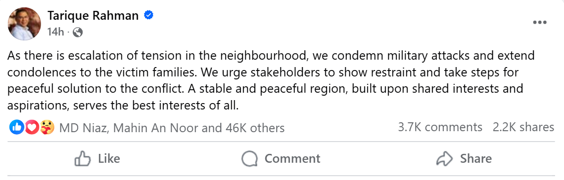 তারেক রহমান লেখেন, “যেহেতু আশেপাশে উত্তেজনা বৃদ্ধি পাচ্ছে, তাই আমরা সামরিক হামলার নিন্দা ও ক্ষতিগ্রস্ত পরিবারের প্রতি সমবেদনা জানাই। আমরা সংশ্লিষ্ট সকলকে সংযম প্রদর্শন এবং সংঘাতের শান্তিপূর্ণ সমাধানের জন্য পদক্ষেপ নেওয়ার আহ্বান জানাই।”